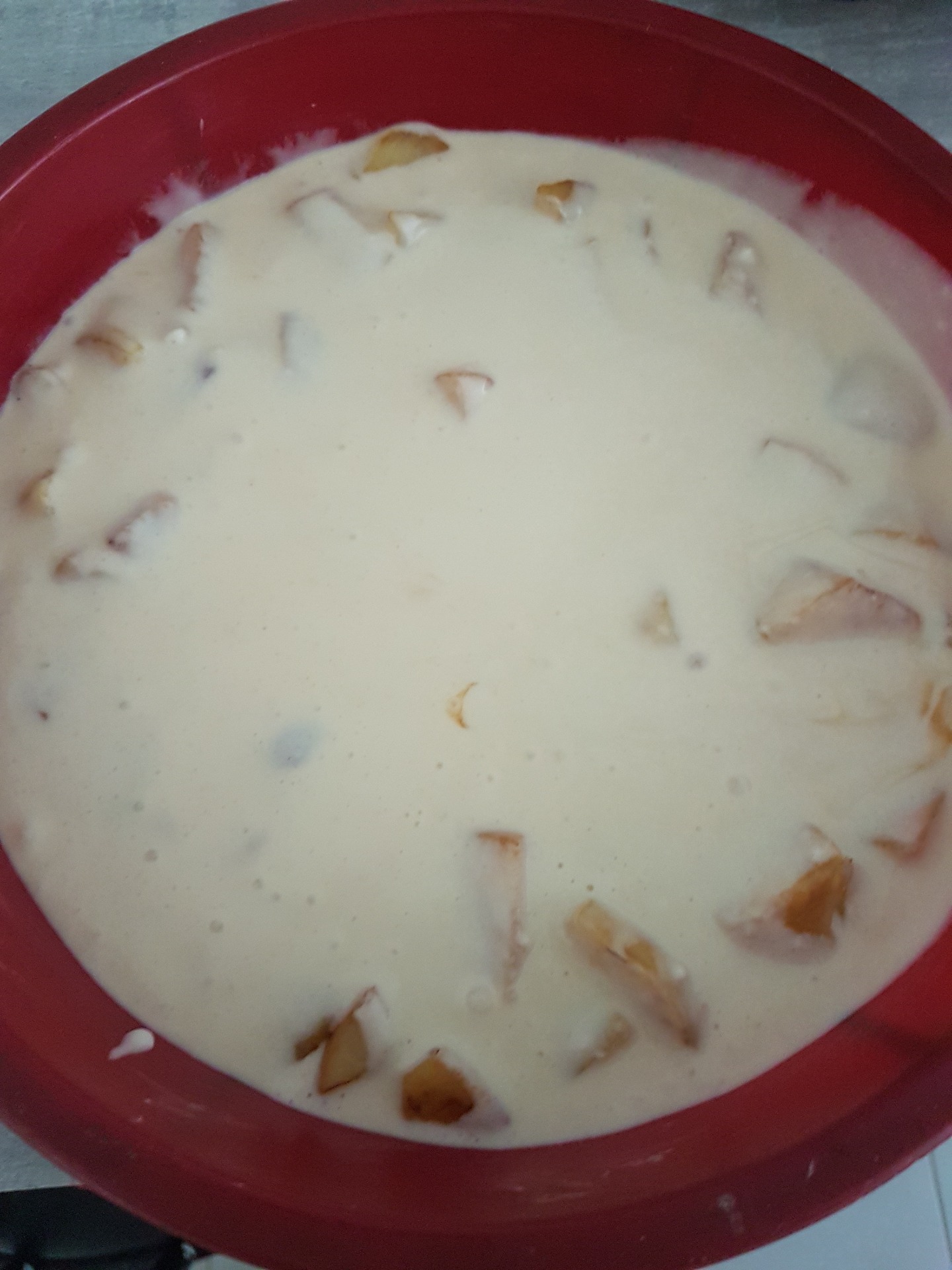 Mettre les pommes au fond du plat et verser la pâte par dessus.